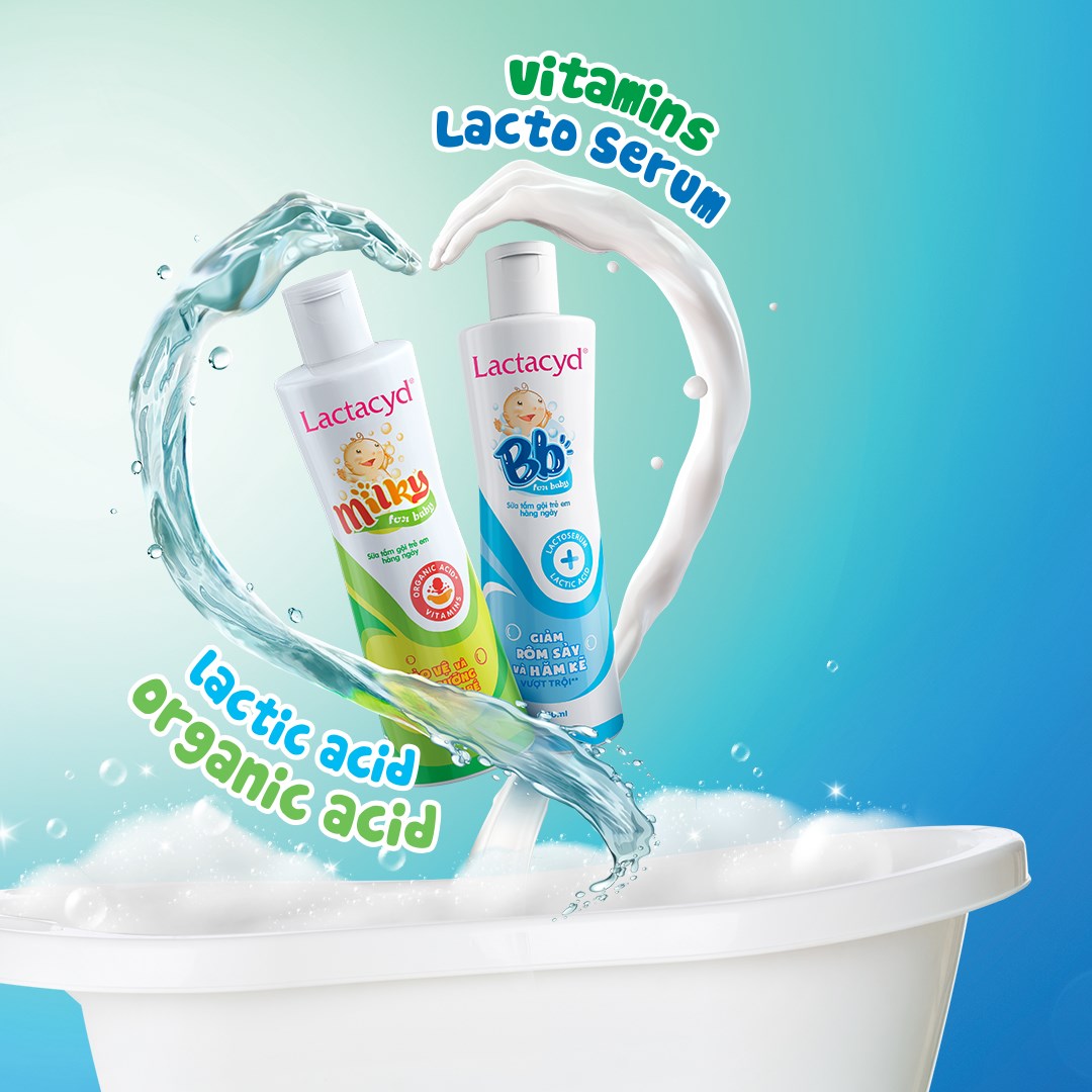 Lactacyd chứa thành phần tự nhiên Lactic Acid & Lactoserum chiết xuất từ sữa giúp duy trì lớp màng bảo vệ tự nhiên trên da, bảo vệ da, đặc biệt là làn da em bé khỏi các kích ứng.